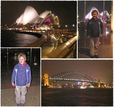 Once all that was over and done with then we were off on a BIG NIGHT OUT!! I knew we were going to the city and I knew we were having dinner there - but what we were doing after dinner was a big surprise. It was all part an early birthday present for Mummy and a reward for me after a yukky afternoon at the hospital. So we drove into the city. Then walked form Darling Harbour to the train station - we got SOAKED! The weather was horrible and so we get the train from Town Hall to Circular Quay. Then Mummy and Daddy made me walk all the way to the Opera House - before Dinner!! Of course what I didn't realise is that the big surprise was that we were going to see Circus Oz at the Opera House. WOW!!!! So we went to get the tickets and then headed back to grab some food before the show.